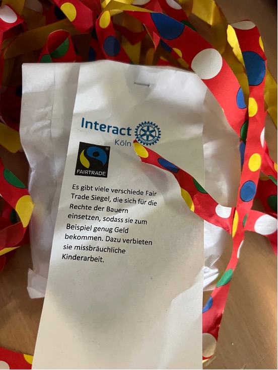 Durch unseren Besuch im Schokoladenmuseum, wo wir viel über Fairtrade gelernt haben, inspiriert, haben wir beschlossen Fairtrade-Produkte für einen guten Zweck zu verkaufen. Am 20. Februar 2022 haben wir, der Interact-Club Köln, uns mittags getroffen und Tüten mit Fairtrade-Produkten gefüllt. Diese Produkte haben wir bei einem vorherigen Treffen schon ausgesucht und anschließend besorgt. Wir haben die Tüten mit unterschiedlichen Produkten gefüllt: Schokoladenkekse und Schokoladen- und Obstriegel. Diese Tüten haben wir im Laufbandverfahren befüllt und nach sehr kurzer Zeit waren wir fertig.
